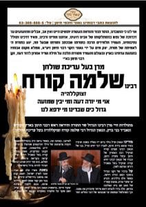 לקיים בנו חכמי ישראל הציבור מתבקש לעורר רחמי שמים מרובים על מורנו ורבינו רב העיר בני ברק וזקן רבני תימן הגאון רבי שלמה קורח בן יחיא ונעמי שליט"א עקב מצבו